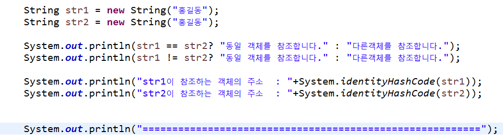 identityHashCode() 이 메서드를 통해서 같은 내용이지만 new String() 로 만들었기 때문에 달라진것이다 !